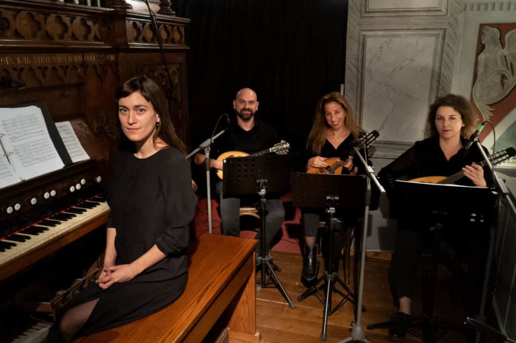 Ντορίν Λασκαρίδου (μαντολίνο, κιθάρα), ο Λάμπης Μητσιάκης (μαντολίνο) και η Αριάδνη