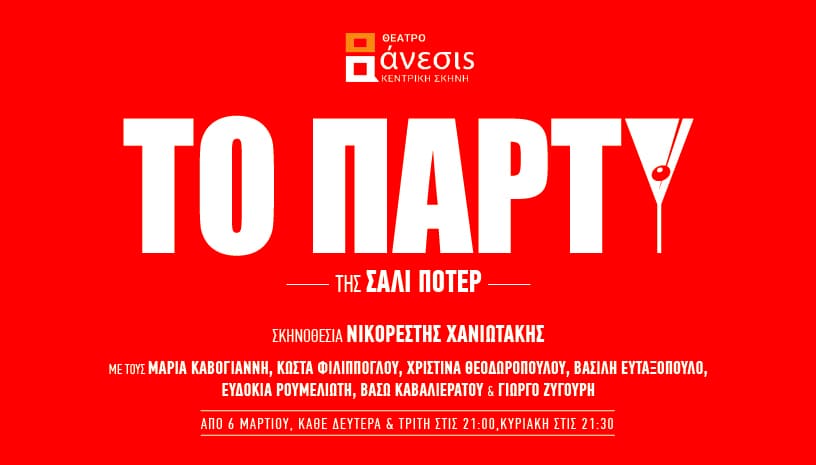 Το “Party” αρχικά έγινε ασπρόμαυρη κινηματογραφική ταινία το 2017 σε σενάριο και σκηνοθεσία της Sally Potter με πρωταγωνιστές τους Κρίστιν Σκοτ Τόμας, Κίλιαν Μέρφι, Τίμοθι Σπολ, Τσέρι Τζόουνς, Εμιλι Μόρτιμερ, Πατρίτσια Κλάρκσον και Μπρούνο Γκαντς. Η ταινία σημείωσε μεγάλη επιτυχία. Στο φεστιβάλ του Βερολίνου κέρδισε το Guild Film Prize, ενώ ήταν υποψήφια και για την Χρυσή Άρκτο. Στην θεατρική σκηνή, οι θεατές έχουν την ευκαιρία να παρακολουθήσουν μια ιστορία, η οποία εξελίσσεται ταυτόχρονα σε όλους τους χώρους ενός σπιτιού σε ρεαλιστικό χρόνο, χωρίς «άλματα» στο παρελθόν ή στο μέλλον. Συγκεκριμένα, όλη η δράση διαδραματίζεται στο σπίτι της Τζάνετ, η οποία μόλις διορίστηκε Σκιώδης Υπουργός Υγείας από το Κόμμα της Αντιπολίτευσης και το… γιορτάζει!