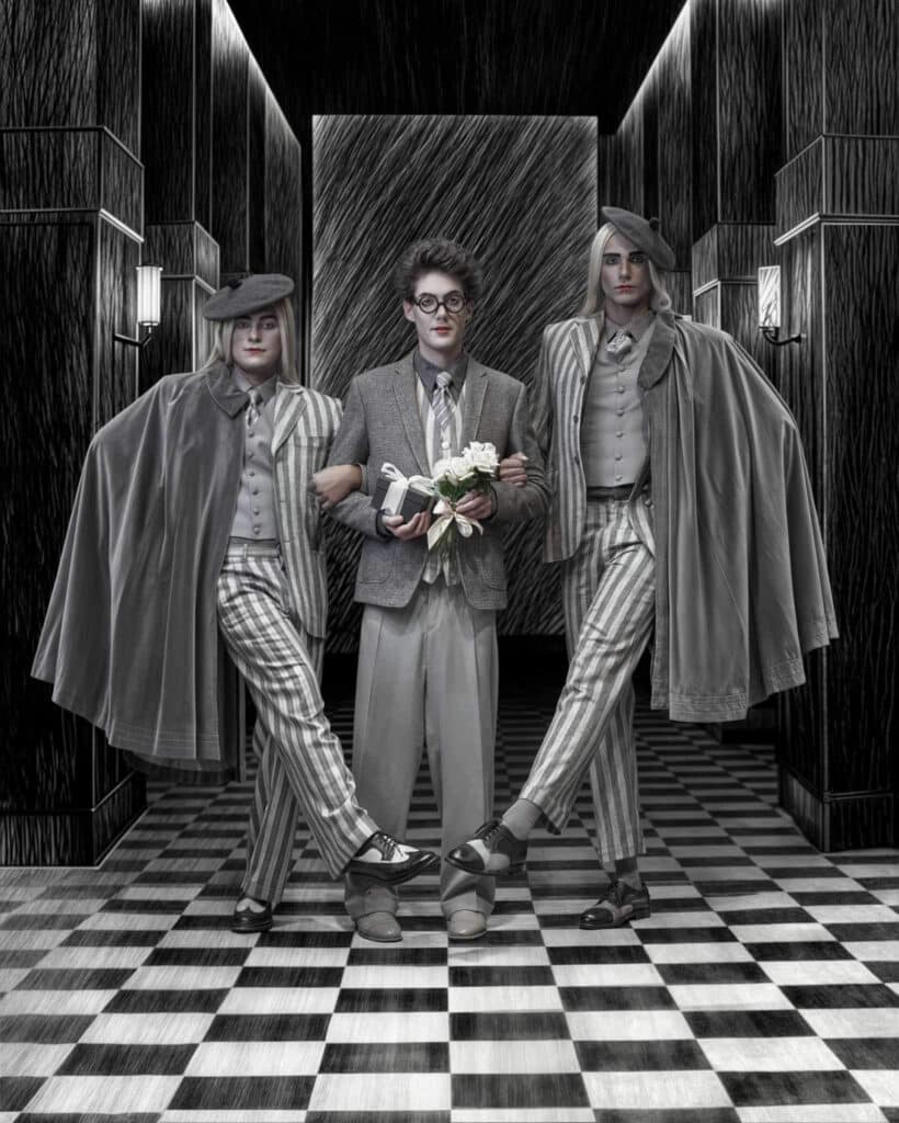 Σ΄αυτή την παράσταση στους ρόλους υπάρχουν μεταμφιέσεις, που είναι πολύ έντονες – ποσο μάλλον στον δικό μου ρόλο- οι οποίες με αφορούν πάρα πολύ, γιατί μου θυμίζει το γιατί, από παιδί, ήθελα να γίνω ηθοποιός. Και η μεταμφίεση είναι ένας απ΄ τους ισχυρούς λόγους που μπορεί να θέλει να γίνει κανείς ηθοποιός. Ότι σαν παιδάκι σ’ αρέσει να μπαίνεις σε ρόλους, ντύνεσαι, φτιάχνεσαι, σ΄αρέσει να παίζεις. Αυτό βοηθάει πάρα πολύ στη χαρά που έχεις για να βγεις από την κουίντα στη σκηνή. Στην παράσταση αυτή, βγαίνω και είναι το πρόσωπο μου βαμμένο, μιλάω διαφορετικά, έχει μια φόρμα ο λόγος και αγγίζει πολύ αυτή τη χαρά. Αλήθεια.